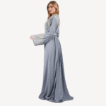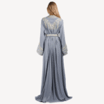 Sublimez votre allure avec cette Takchita fluide de Mautassin, une pièce d’exception mariant la douceur d’un gris perle raffiné à la noblesse de broderies dorées délicates. Chaque détail est travaillé avec soin pour offrir une silhouette gracieuse et royale.