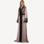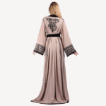 Mystérieuse et captivante, la Takchita Farah Mautassin joue le contraste entre un gris fumé soyeux et des broderies noires généreuses. Son tissu fluide accompagne le mouvement avec grâce, pour un port confortable et sophistiqué.