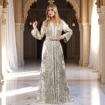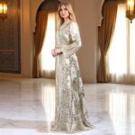 La Takchita Sélène incarne la poésie des couleurs tendres et l’élégance marocaine dans sa forme la plus délicate. Dans une nuance nude clair, cette pièce fluide et aérienne est sublimée par un travail d’ornement doré, ponctué de touches pastel en rose tendre, lavande claire et vert menthe pâle, évoquant un univers doux et raffiné.